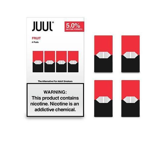 - A package of four premium-quality JUUL salt e-liquid pods in a tantalizing fruit flavor
